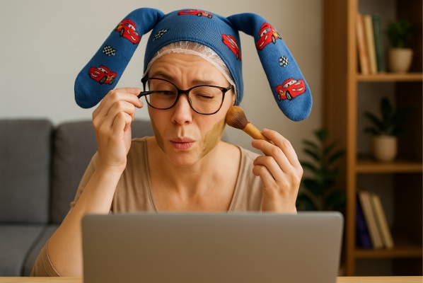 Dziewczyny, to był ten wieczór, kiedy wcieram olejek rycynowy w włosy, zawijam głowę w folię i – klasycznie – zakładam dziecięce rajstopy po synku, takie z samochodzikami. Dzięki nim olej nie cieknie i ciepło się trzyma. Super patent – polecam.